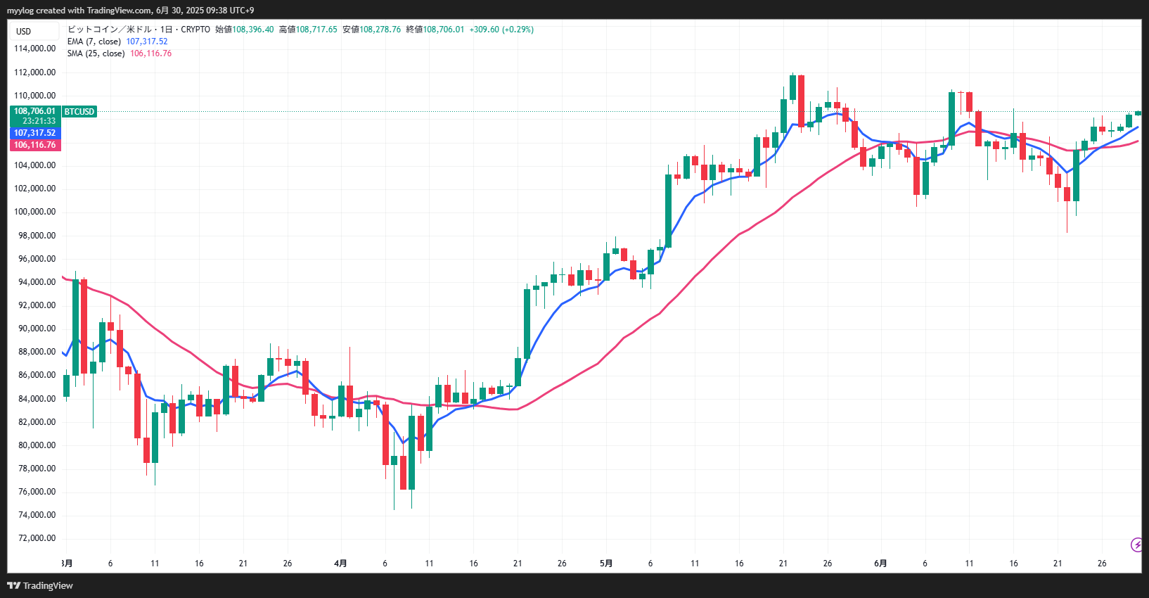 - ビットコインは108,700ドル台で堅調推移、短期・中期トレンドともに上昇基調を維持