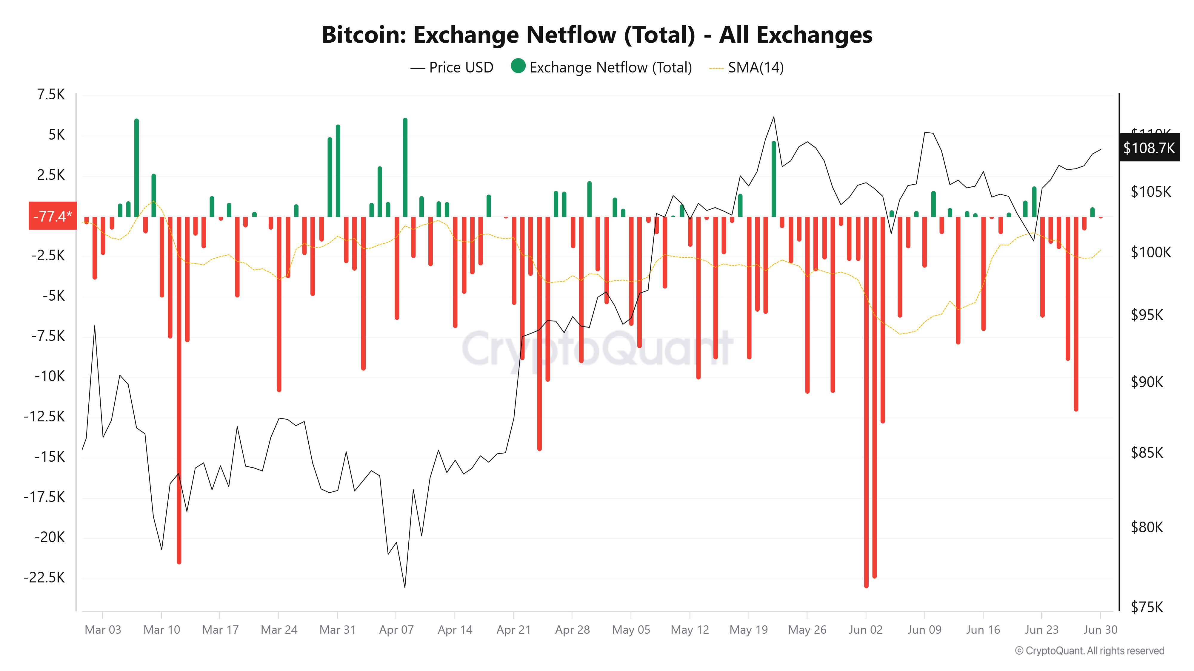 2025年6月30日時点の取引所ネットフローは -77 BTC(流出超)で、SMA(14日)は -2,068 BTC と依然として流出基調が続いています。取引所からの資金引き上げは、長期保有志向やセルフカストディへの移行を反映しており、需給面での下支え要因と考えられます。