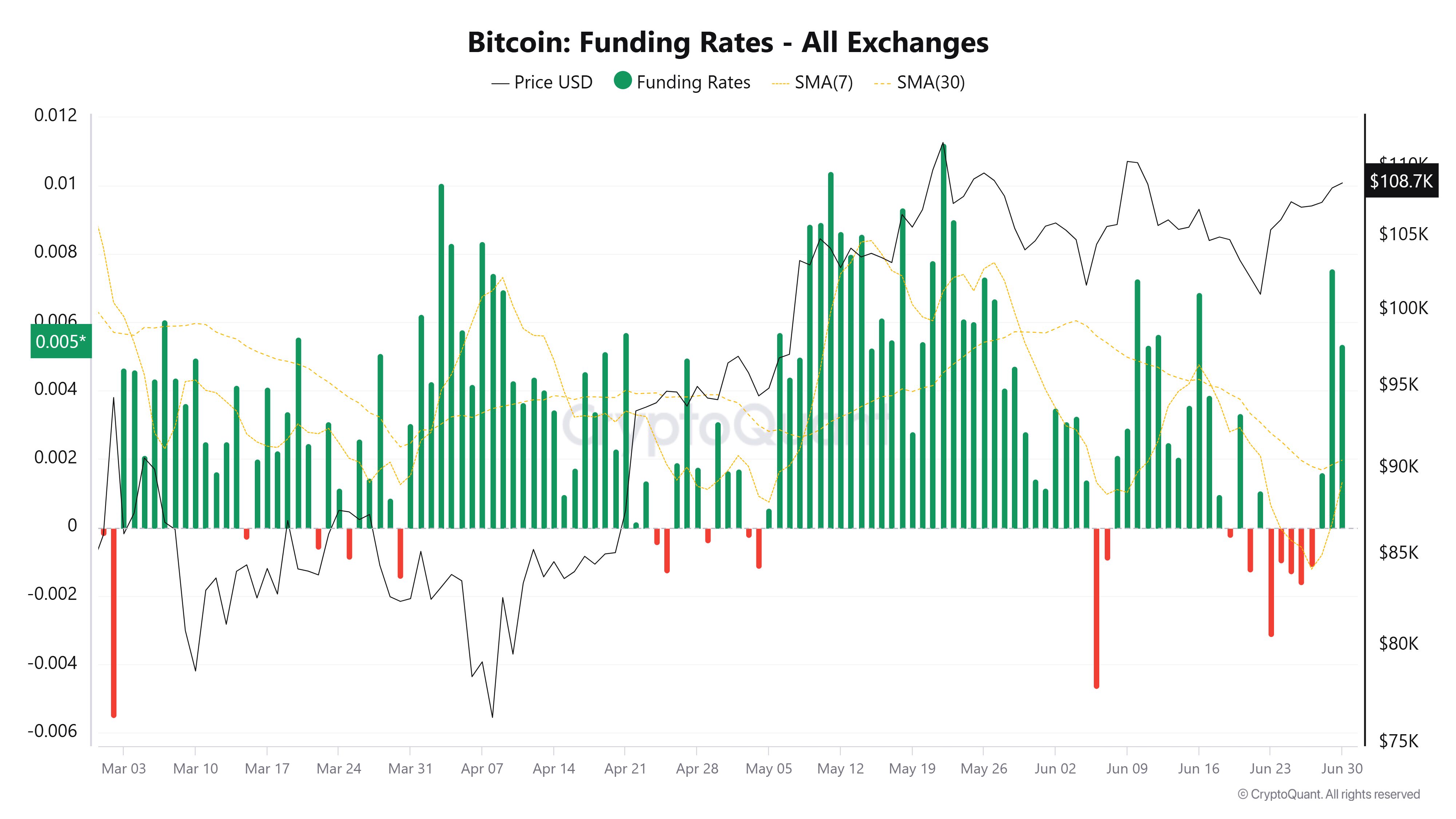 2025年6月30日時点の資金調達率は +0.0053% と、前日比でプラス圏を維持。SMA(7日)は +0.00134%、SMA(30日)は +0.00197% であり、中短期の平均もプラス圏を回復しています。ポジションはロング優勢で、強気姿勢が徐々に再燃する兆しが見られます。