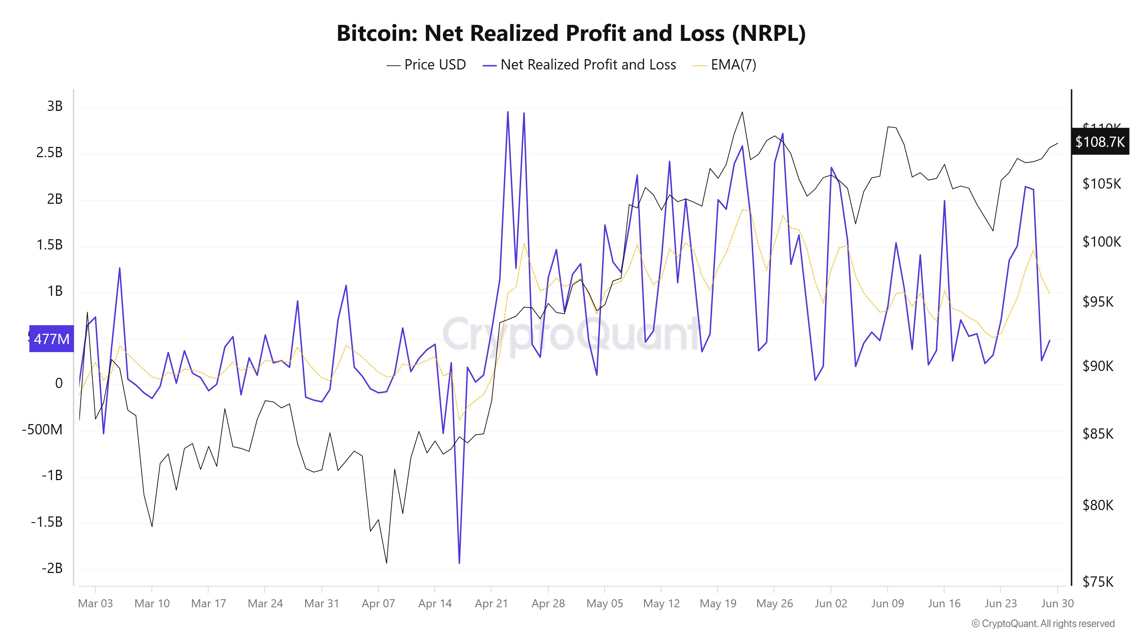 2025年6月29日時点のNRPL(実現損益)は +4.77億ドル($477M)となり、前日比で減少。EMA(7日)は約 +9.89億ドル と引き続き高水準にあります。利確が続いている一方、規模の縮小は一旦の売り圧力の和らぎも示唆しています。
