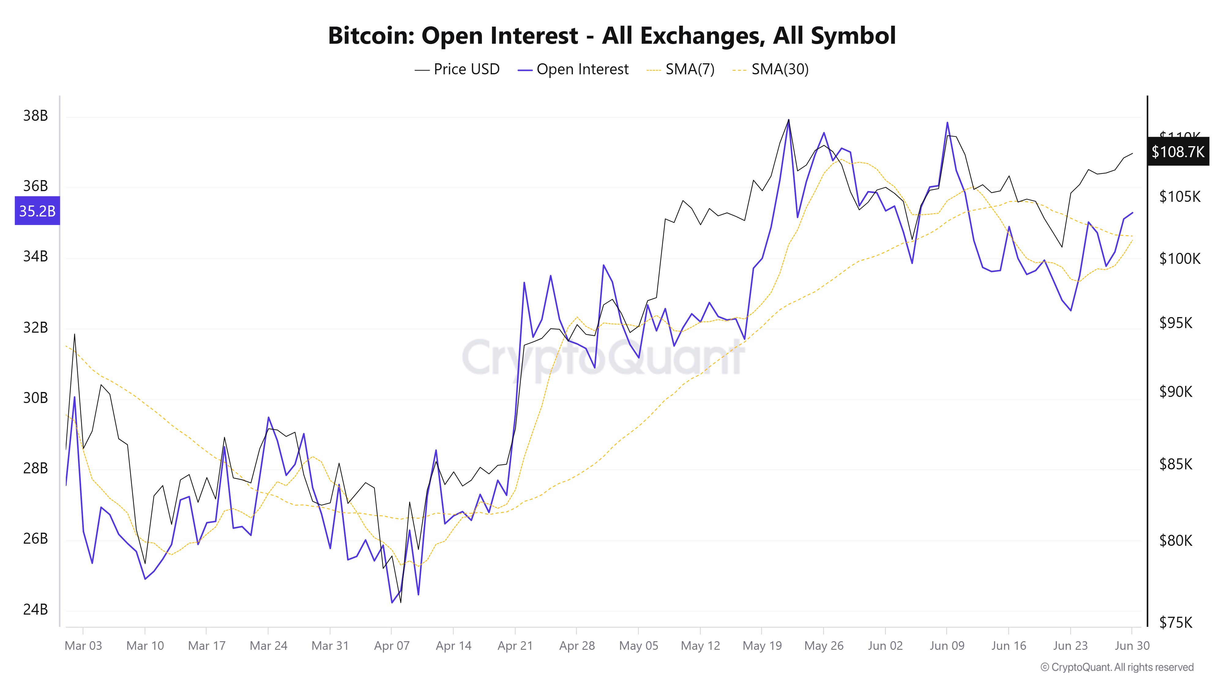 2025年6月30日時点での未決済建玉(OI)は $35.28B。SMA(7日)$34.50B、SMA(30日)$34.62B を上回り、建玉の積み上がりが確認されます。価格上昇とともにポジションが増加しており、強気なポジショニングが進んでいることが伺えます。