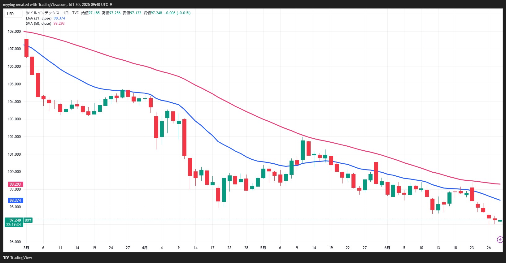 米ドル指数(DXY) | 97.347 | -0.362 (-0.37%) | 下落トレンド継続。リスク資産には追い風 |