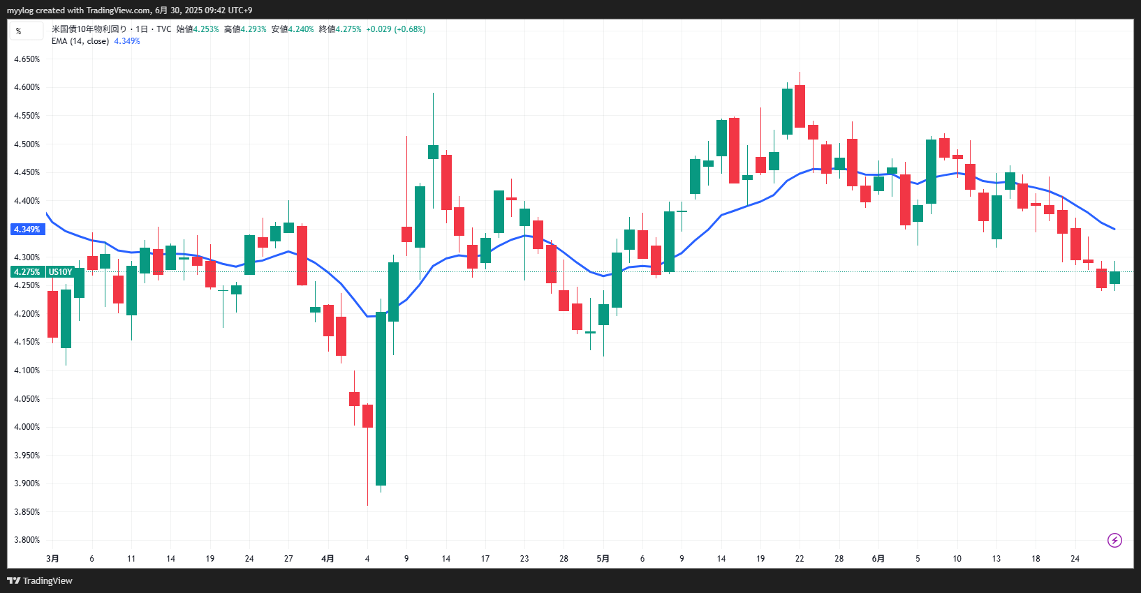 米10年債利回り(US10Y) | 4.246% | -0.045 (-1.05%) | 利回り低下。EMA割れで金利低下基調続く |