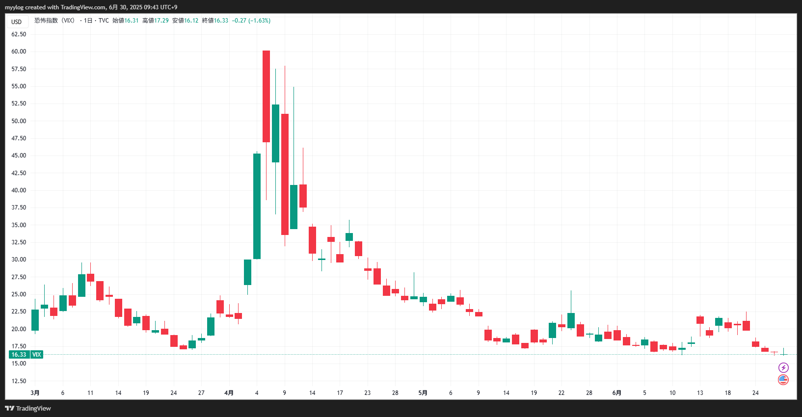 恐怖指数(VIX) | 16.60 | -0.15 (-0.90%) | センチメント改善が進み市場は楽観ムード |